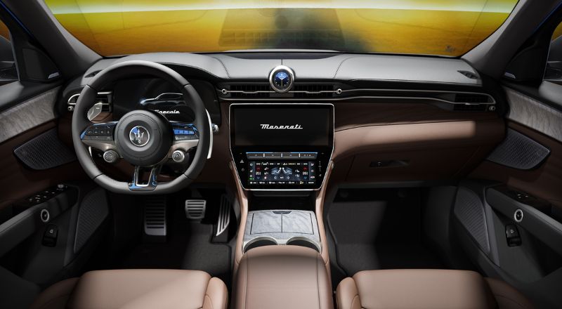 El habitáculo del Grecale Lumina Blu rinde homenaje al diseño italiano, con una mezcla exquisita de materiales nobles y acabados tecnológicos. Los asientos, disponibles en cuero premium Chocolate o Ghiaccio, se combinan con detalles en madera natural de poro abierto y pedales deportivos en acero, creando un ambiente sofisticado y acogedor.
