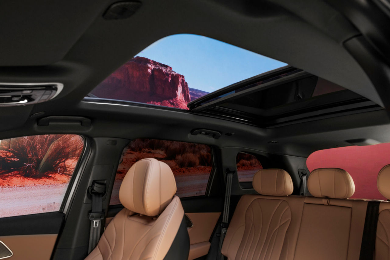El sistema de reconocimiento de voz con cuatro micrófonos permite controlar múltiples funciones desde cualquier plaza del vehículo, incluyendo climatización, navegación, sistema multimedia y apertura de ventanillas. La conectividad incluye compatibilidad con Apple CarPlay y Android Auto, carga inalámbrica de 50W y múltiples puertos USB distribuidos por el habitáculo.