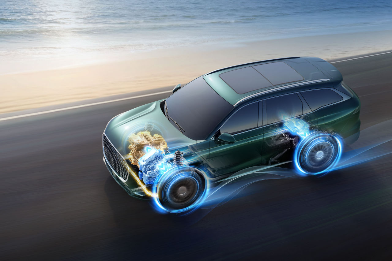 El sistema 4x4 del s900 PHEV se fundamenta en una configuración que combina tres motores eléctricos con un motor térmico, estableciendo un enfoque claramente orientado hacia la movilidad electrificada. Dos motores eléctricos actúan sobre el eje delantero, integrados junto a la transmisión automática 3DHT de tres relaciones, mientras que un tercer motor eléctrico independiente gestiona el eje trasero.