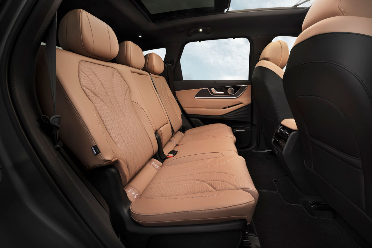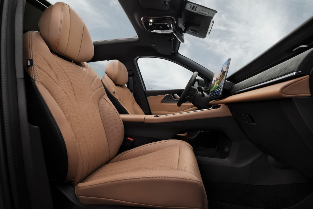 El habitáculo combina piel en tonos negro y marrón, con molduras en símil madera y detalles metálicos. Los asientos delanteros cuentan con ajustes eléctricos (12 posiciones en el conductor), calefacción, ventilación y función de masaje con 5 modos. La segunda fila incluye calefacción, ventilación y desplazamiento longitudinal de hasta 260 mm.