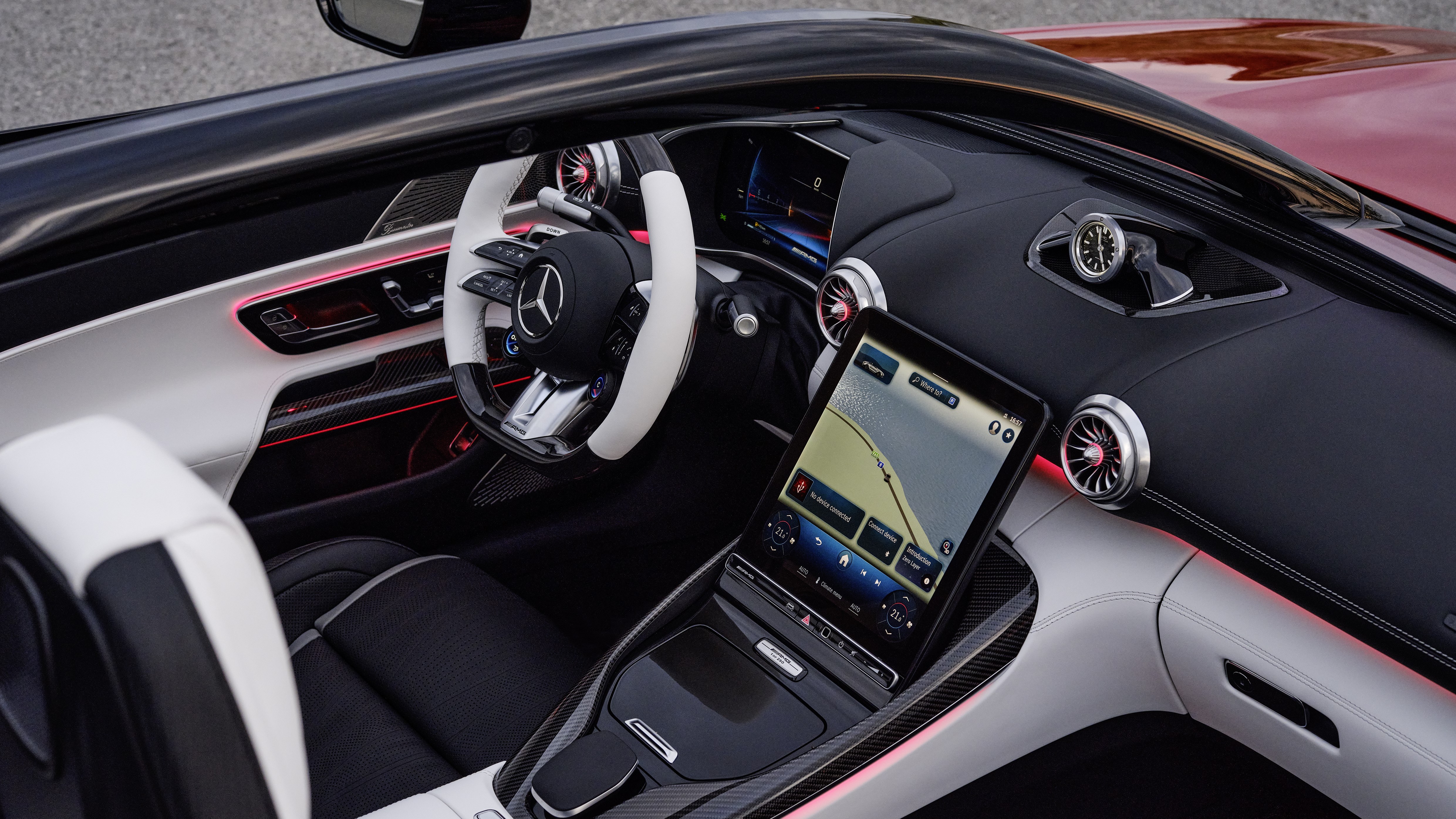 El interior del PureSpeed es una obra de arte en sí mismo. Los asientos deportivos, tapizados en cuero de alta calidad y con un diseño envolvente, ofrecen una sujeción lateral óptima y un confort excepcional. El volante deportivo AMG, con su diseño ergonómico y los botones multifunción, permite al conductor controlar todas las funciones del vehículo de forma intuitiva. Las dos palas situadas detrás de los asientos llevan el logo de AMG como homenaje a coches de carreras legendarios como el 300 SLR