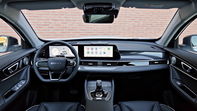 Pero una de las novedades más espectaculares del EBRO s700 es sin lugar a duda, su interior. Fijaos en este habitáculo, a pesar de ser un coche relativamente compacto, aquí dentro hay muchísimo espacio, y es que no solo el diseño del tablero ha sido específicamente diseñado con líneas muy horizontales para inspirar amplitud, sino que a nivel de habitabilidad han conseguido sacarles el máximo jugo a sus cotas.